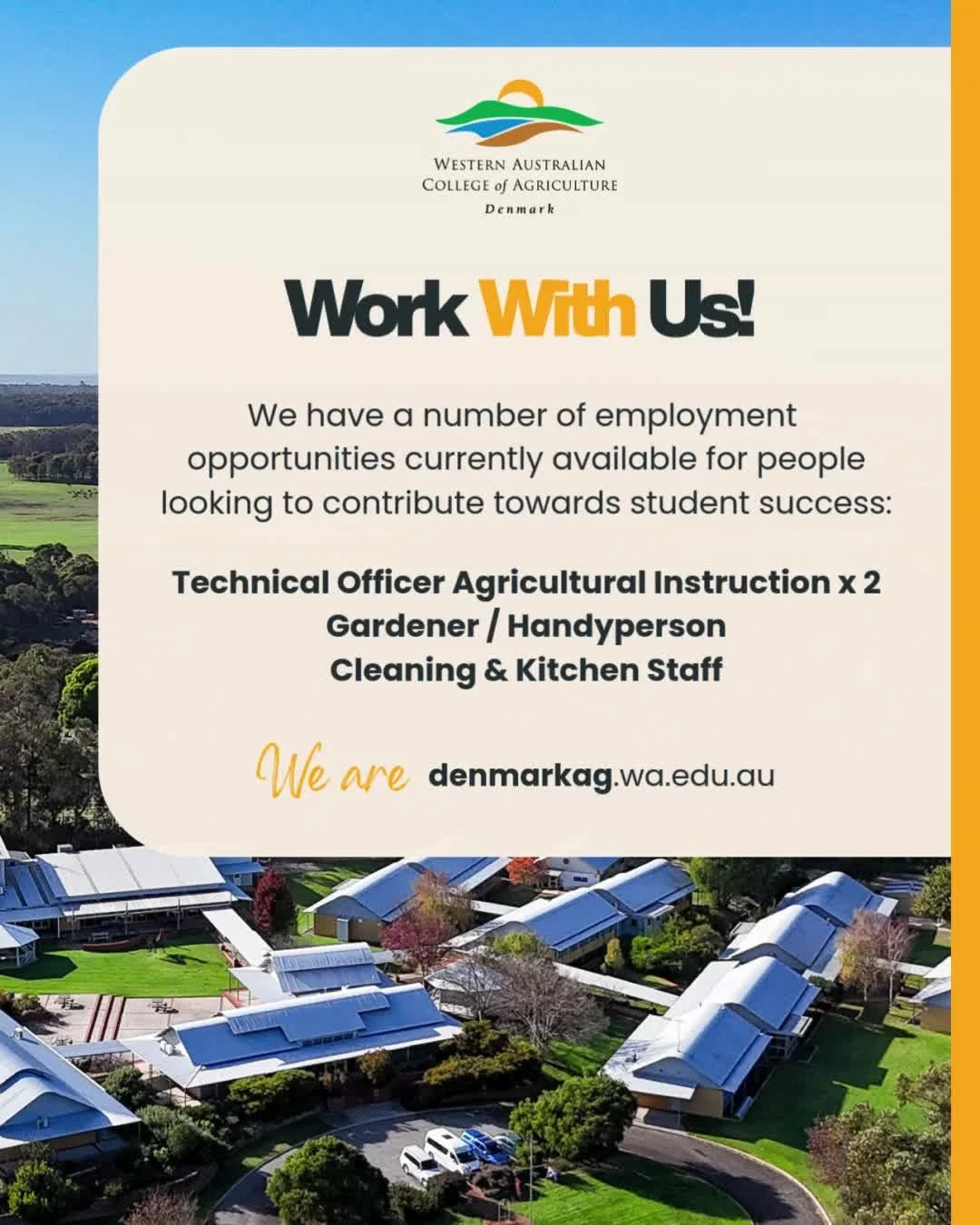 The WA College of Agriculture - Denmark is located east of the town of Denmark and is a 560 hectare working farm and educational facility. Our College offers a wide variety of studies for Year 10, 11 and 12 students in an agricultural and trade related context. Our vocational program gives students the chance to gain skills and competence in their future career while still at School. Students also have the opportunity to gain entrance to University with ATAR pathways provided at the College.