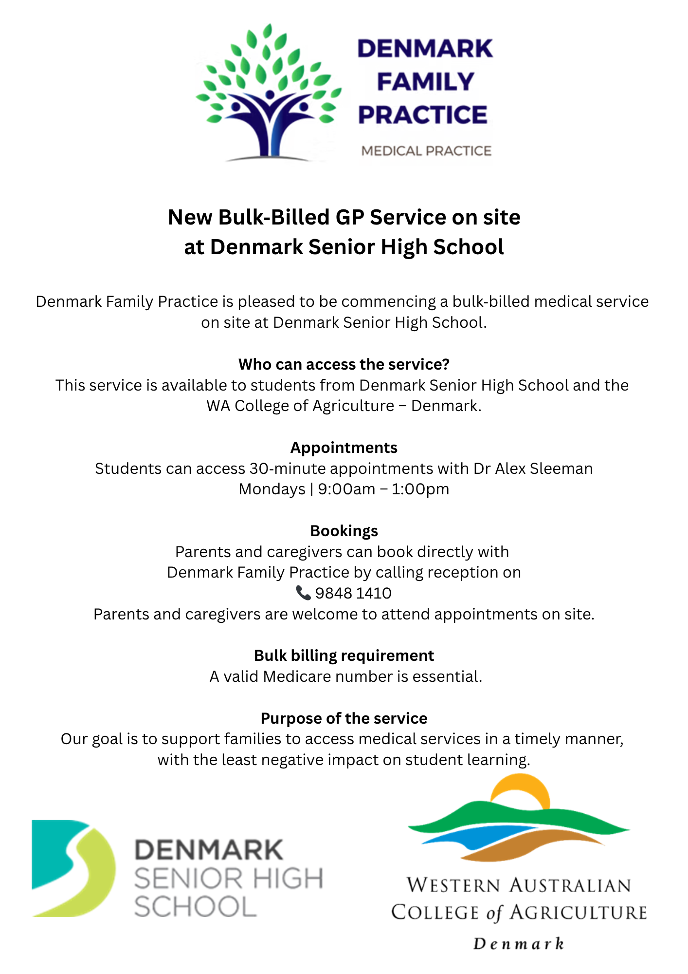 Denmark Family Practice is pleased to be commencing a bulk-billed medical service on site at Denmark Senior High School. This service is only available to students from Denmark Senior High School and WA College of Agriculture - Denmark.