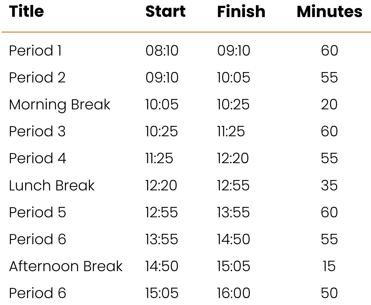 Our College timetable provides a consistent daily structure that supports learning across both classroom and farm activities. Each day includes set lesson periods, breaks, and practical blocks to help students manage their time and stay organised. The schedule below outlines the standard times for each period throughout the school day.